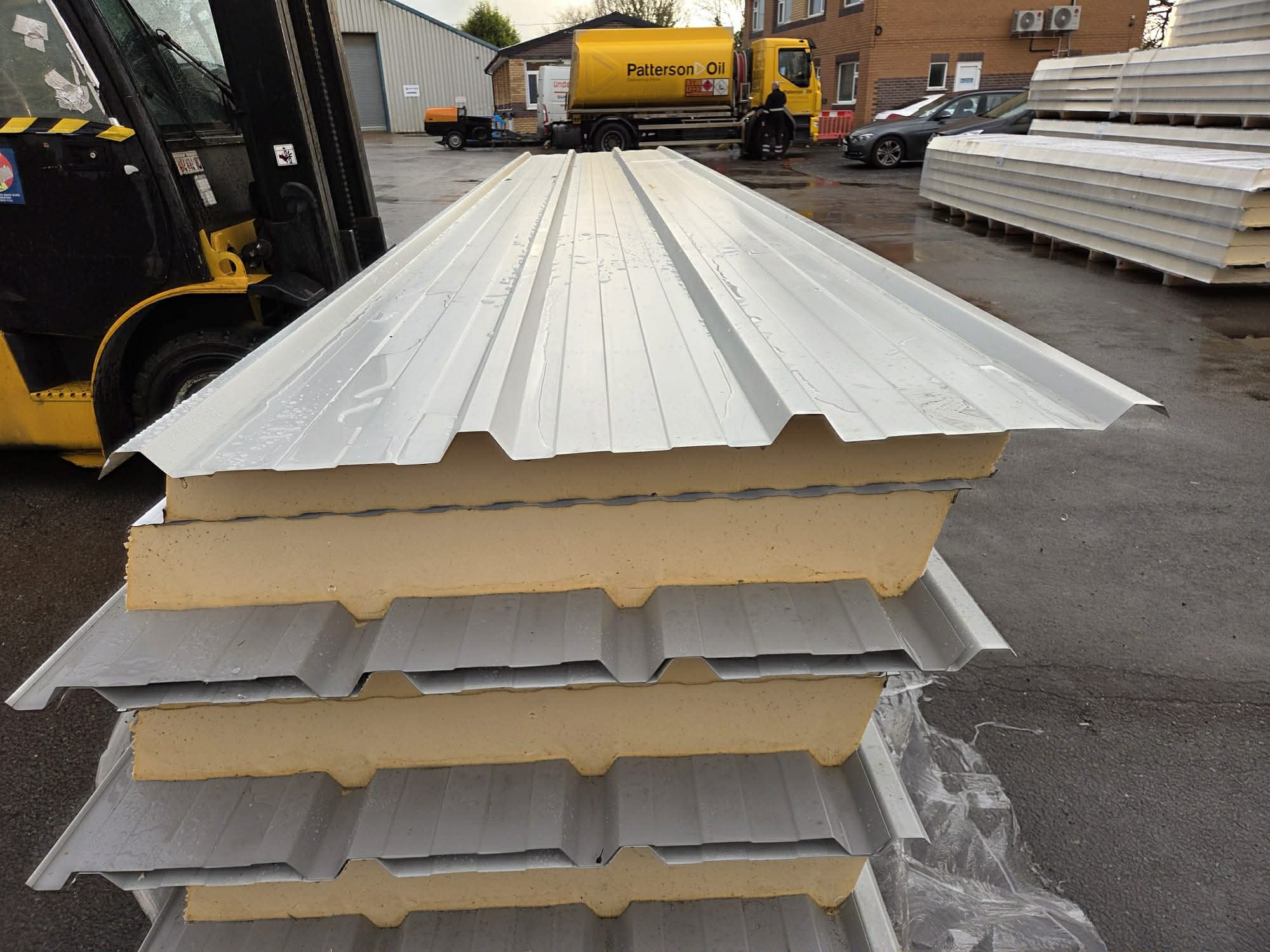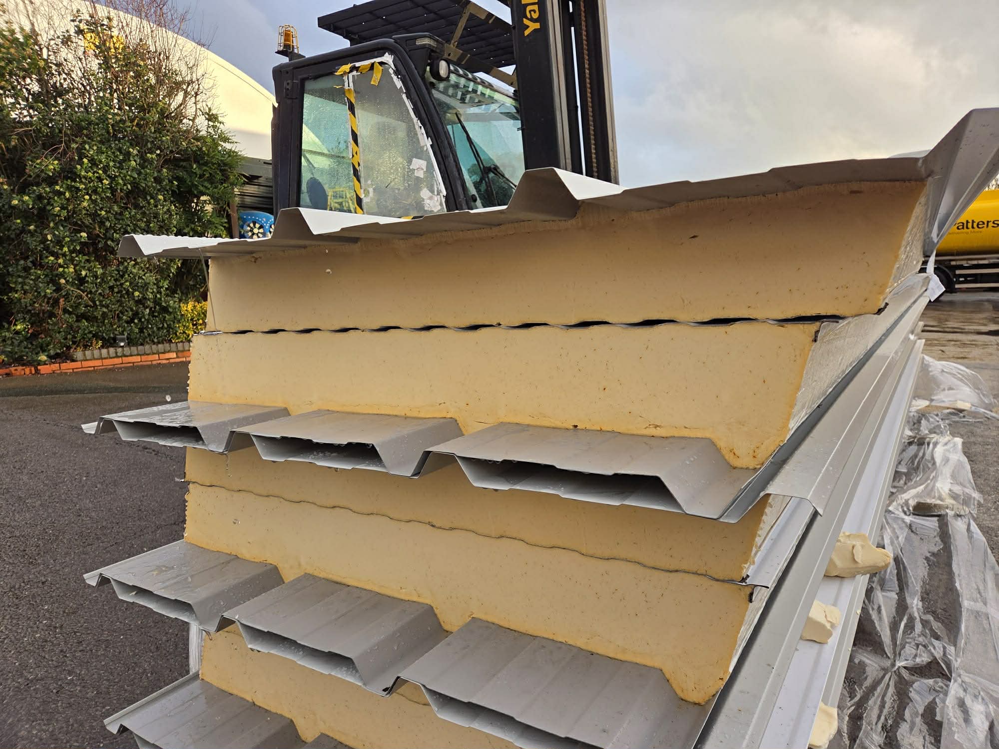 - 6 x 6.01m (20ft) Goosewing Grey PVC Coated Steel Trisomet 333 Composite Panels with 120mm Insulation, cut back 150mm (lay right to left) = £865.44 + VAT = £1038.53